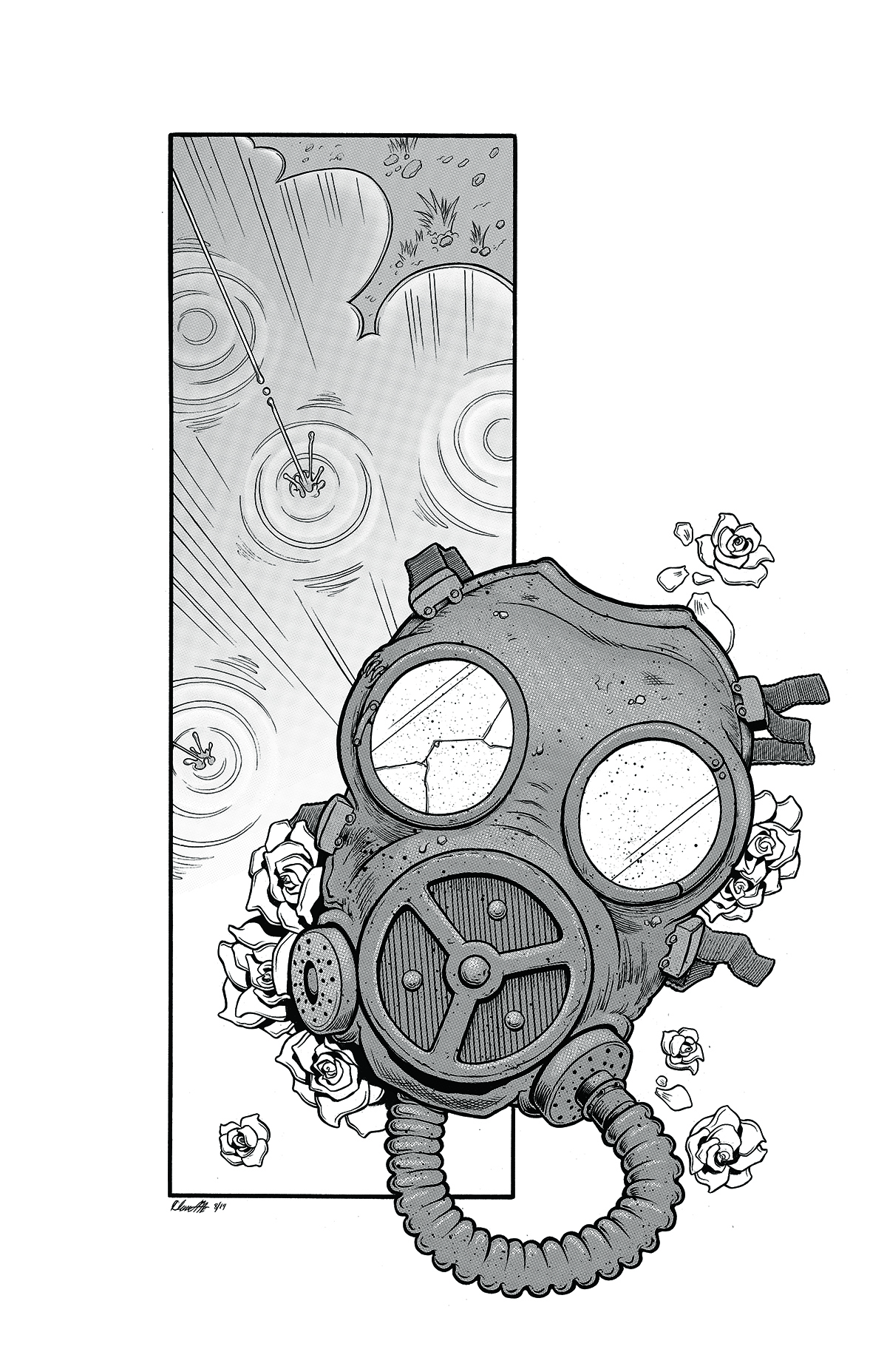 An abandoned gasmask surrounded by roses in a rain puddle. 11in x17in print.
