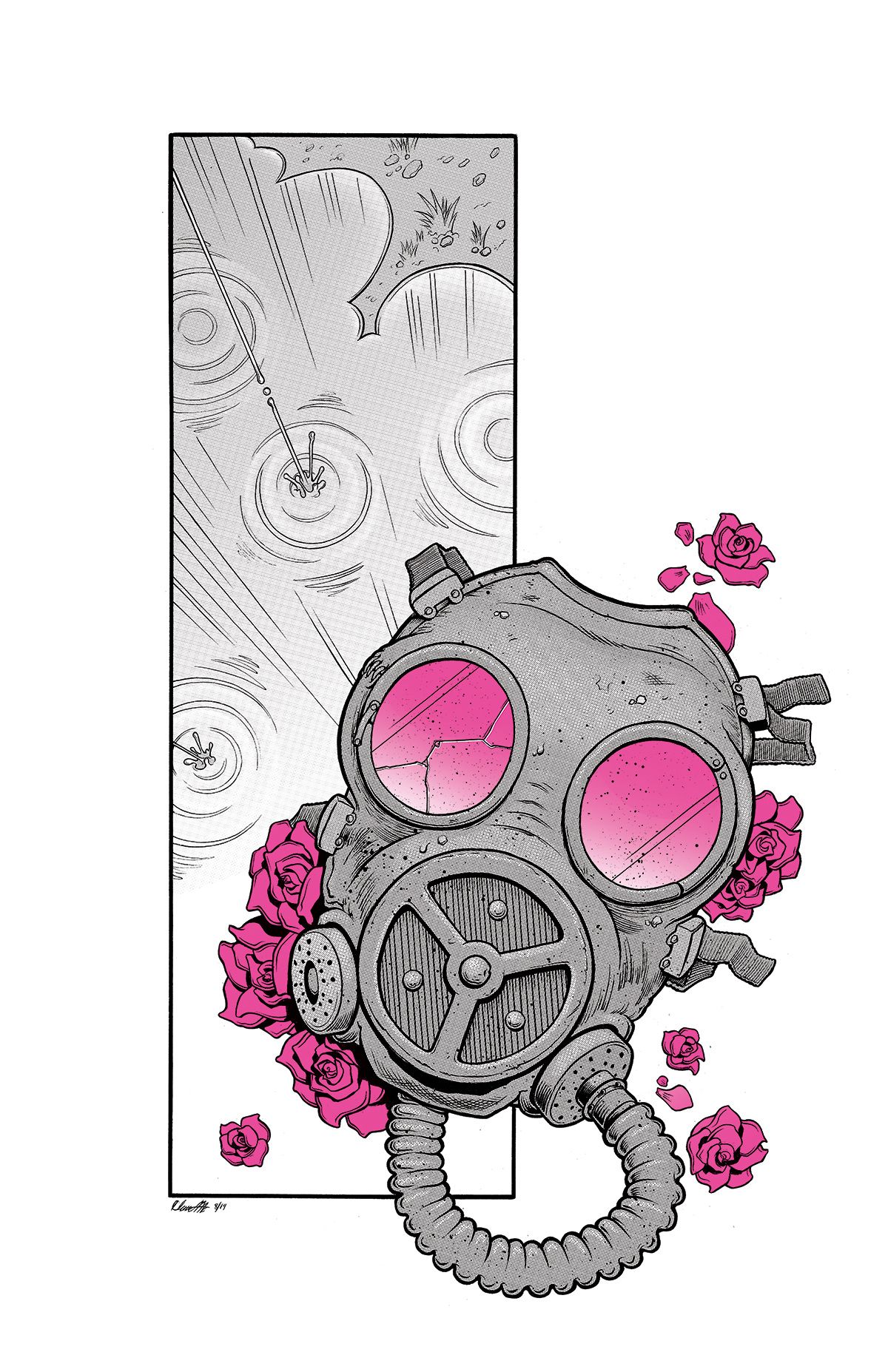 An abandoned gasmask surrounded by roses in a rain puddle with magenta spot color. 11in x17in print.