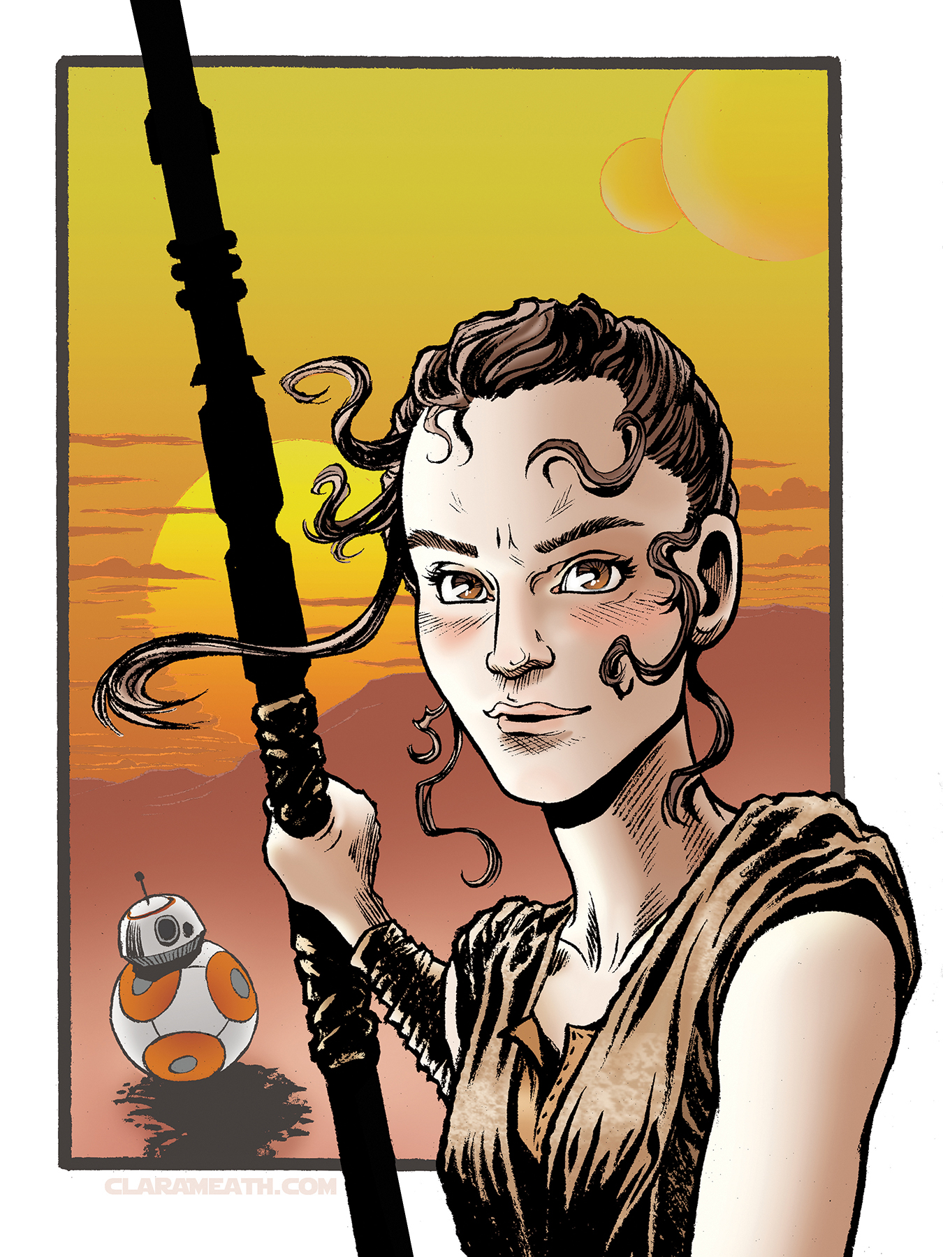 A small (4.5in x6in) full-color print featuring fanart of Rey from Star Wars.