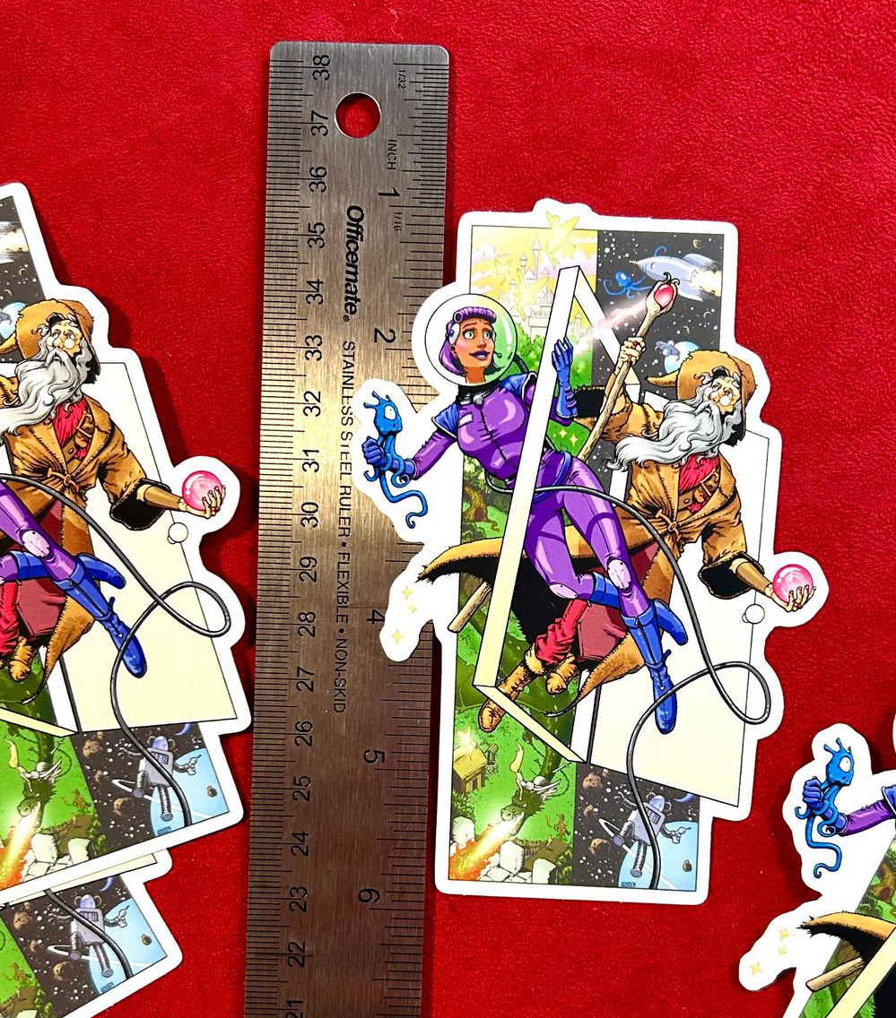 Originally designed and drawn by Clara Meath for ICON 2024, a comic convention in Cedar Rapids, this sticker depicts the genres of science fiction (the astronaut) and fantasy (the wizard) crossing over into one another's worlds. This sticker is approximately "5x3.5" in size.
